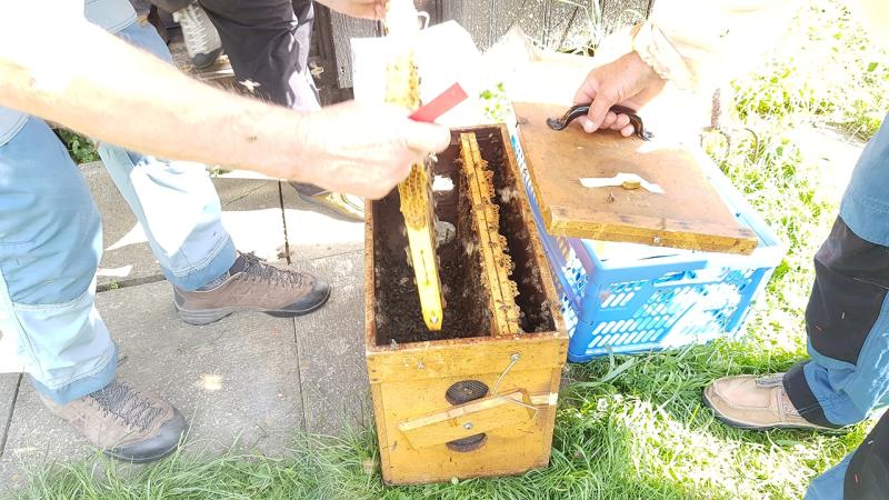 Le déroulement du cours commença par la recherche de la reine dans la colonie choisie pour élever nos larves puis de la formation du starter comme décrite et illustrée sur la page des moniteurs-éleveurs selon la méthode "Elevage de reines, méthode dite à 2 heures"