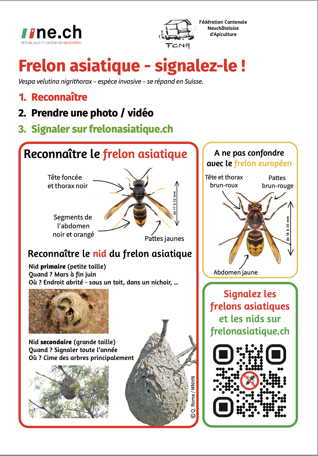 Le site web de référence est www.frelonasiatique.ch. C’est là que doivent être signalées toutes les observations d’insecte ou de nid suspect, avec une image. Le site met également à disposition :